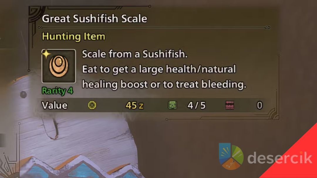 Wskazówka: Dobrym uzupełnieniem jest Great Sushifish Scale, który leczy dużą ilość HP natychmiast. Ten rzadki przedmiot jest szczególnie przydatny w sytuacjach „jednego ciosu od śmierci” i może decydować o sukcesie polowania.