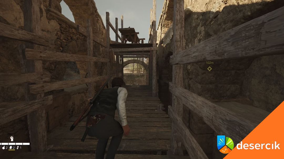 Do środka prowadzą dwa wejścia: jedno po drabinie z lewej, drugie przez prawą część dziedzińca. Obydwa działają, ale lewe jest szybsze i bezpieczniejsze.