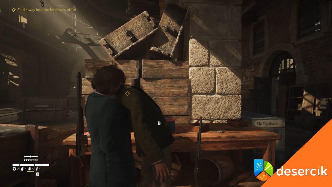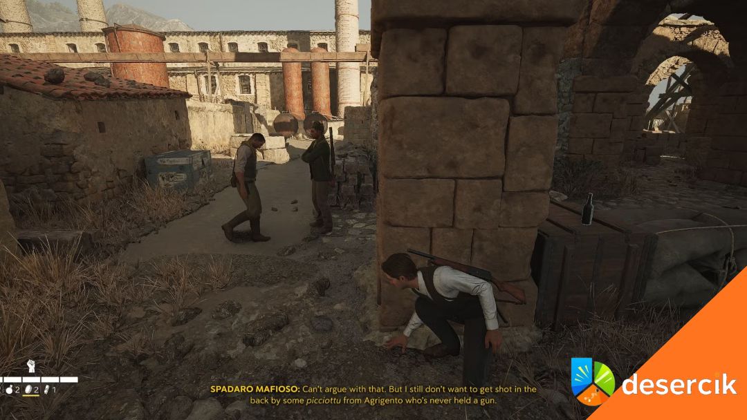 Potem skręć w prawo, gdzie kolejny mafioso pracuje przy stole. Gdy go wyeliminujesz, od razu otwórz pobliską skrzynkę nożem – zawsze to trochę Dinari do kieszeni.