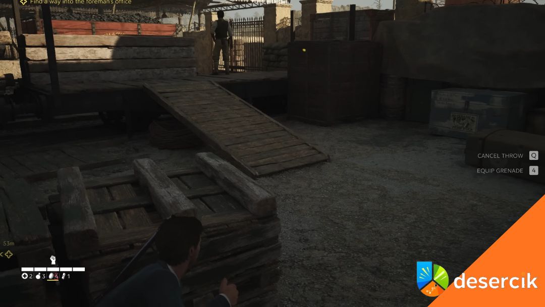 Zaraz po wejściu przykucnij za skrzynkami. Dwóch kolejnych gości będzie prowadzić rozmowę – poczekaj, aż skończą, i zdejmij tego, który opiera się o skrzynki.