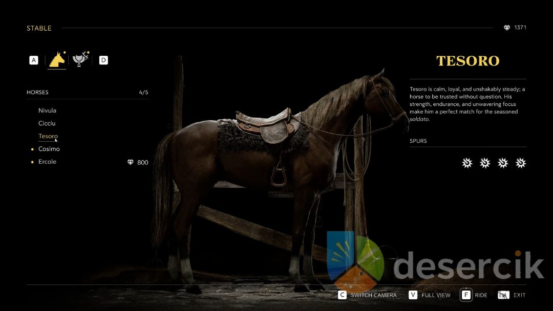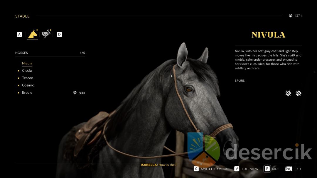 Nowe konie możesz zakupić w stajni. Każdy egzemplarz, którego jeszcze nie posiadasz, ma podaną cenę w dinari. Zazwyczaj konie z trzema ostrogami kosztują około 800 dinari, a te z czterema – 1200. Warto inwestować w droższe egzemplarze, jeśli zależy Ci na częstszych przyspieszeniach, co znacząco ułatwia eksplorację większych obszarów Sycylii.