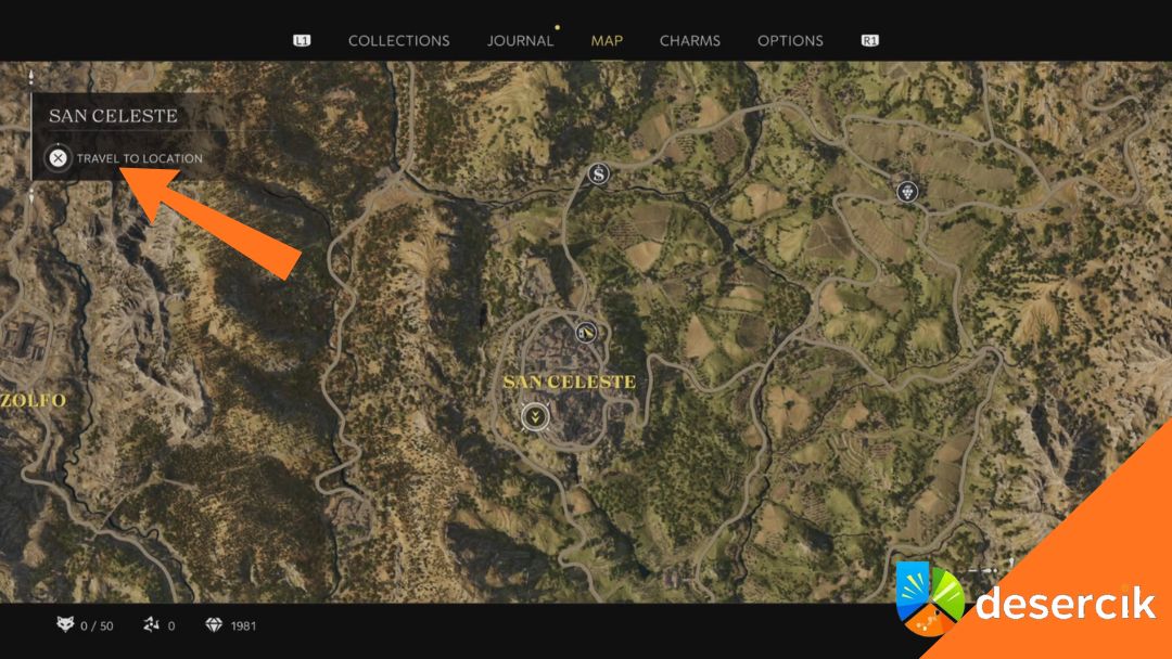 Na mapie punkty teleportacji są oznaczone dwoma strzałkami w dół. Niektóre lokalizacje, np. sklep Pasquale czy winnica, mają własne ikony. Możesz też zobaczyć na mapie znajdźki, takie jak: