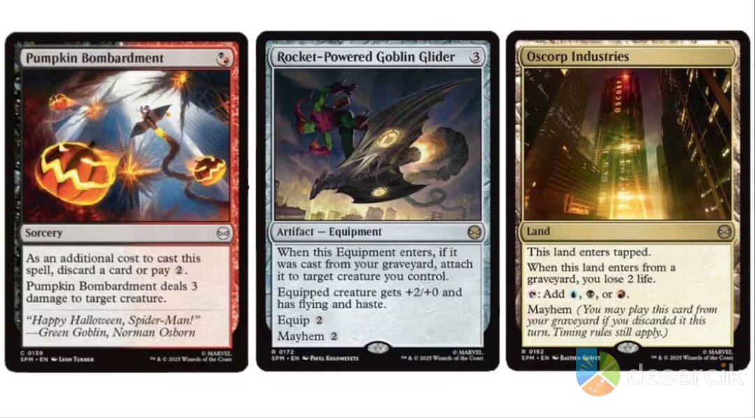 Do gry wchodzą trzy klimatyczne karty – Pumpkin Bombardment, czyli klasyczne „dyniowe bomby” Goblina, Rocket-Powered Goblin Glider, czyli jego szalony latający pojazd, oraz Oscorp Industries, czyli siedziba i źródło całego zamieszania. Każdy, kto choć raz widział potyczkę Spider-Mana z Normanem Osbornem, od razu poczuje, że klimat tych kart jest oddany w punkt.