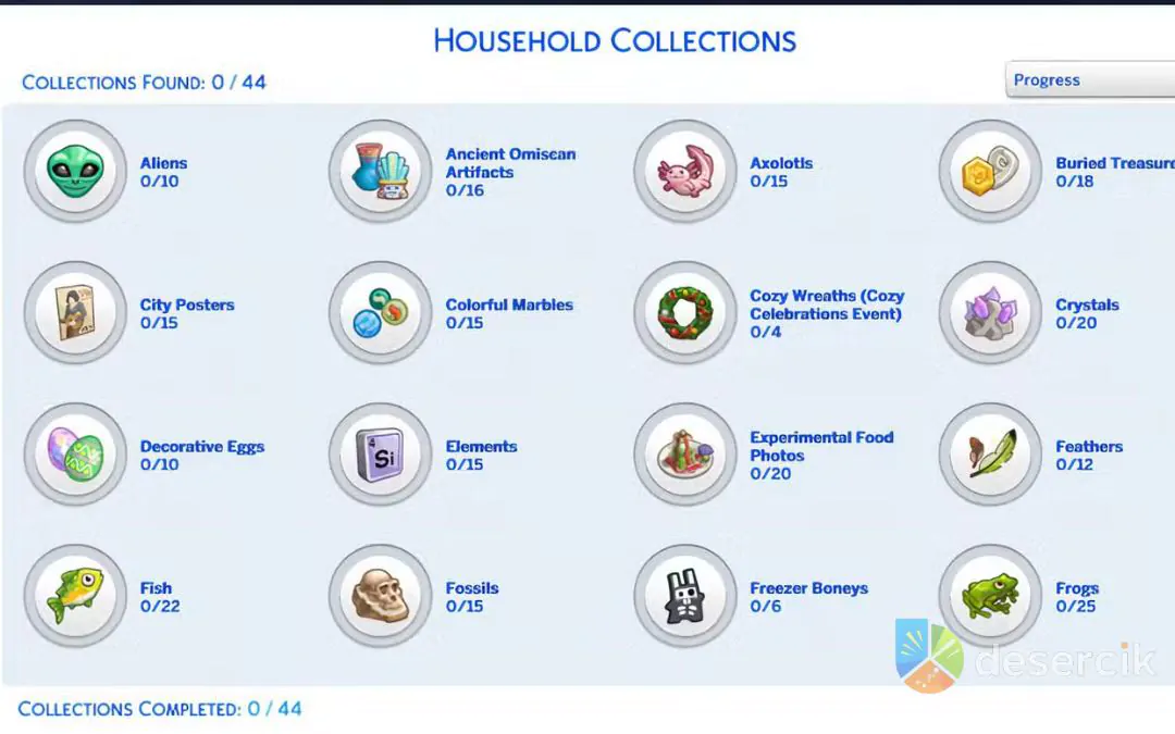 Menu Kolekcji Domowników pozwala sprawdzić wszystkie zbiory całej rodziny w jednym miejscu – bez konieczności przełączania się między Simami. Dla osób, które lubią kompletować kolekcje, to prawdziwe zbawienie.