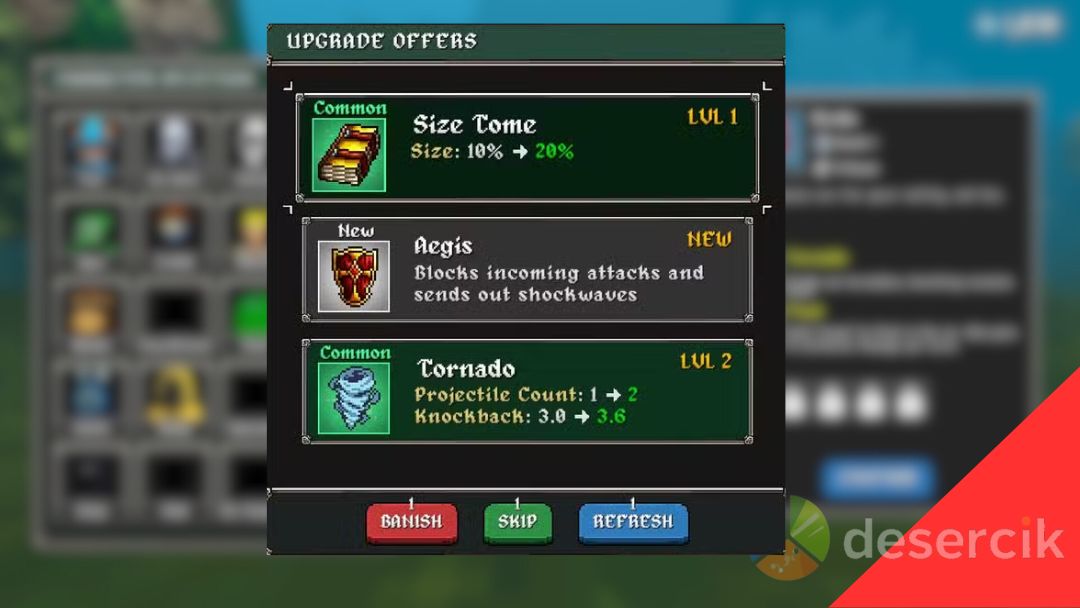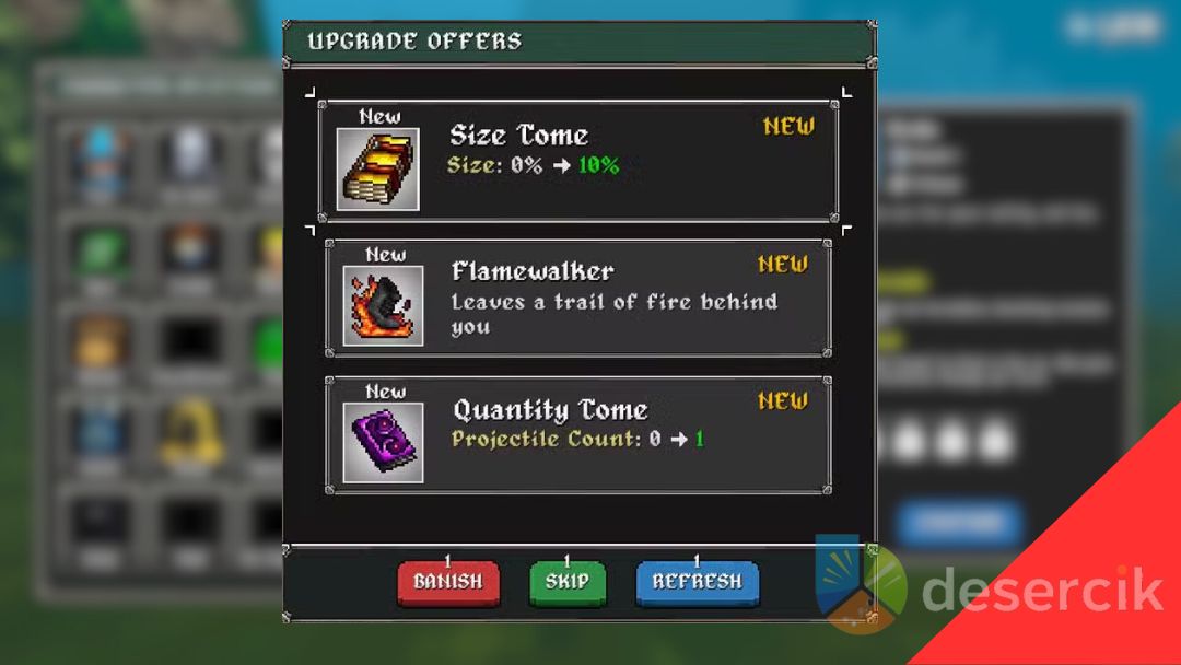 - Size Tome – powiększa promień ataku Tornado i Aura, pozwalając trafić więcej wrogów na raz i kontrolować tłum.