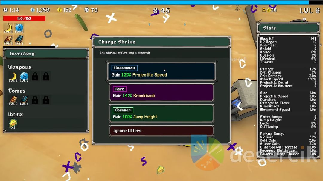 - Refresh pozwala zmienić dostępne opcje upgrade’ów po każdym poziomowaniu, dając kolejną szansę na pojawienie się Cursed Tome.
