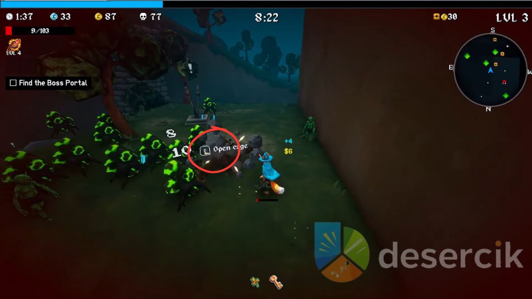 - Znajdź i uwolnij Monke w Lesie – jest to pierwszy poziom Megabonk. Jego klatka nie pojawia się zawsze, więc trzeba uważnie eksplorować mapę i reagować szybko, gdy się pojawi.