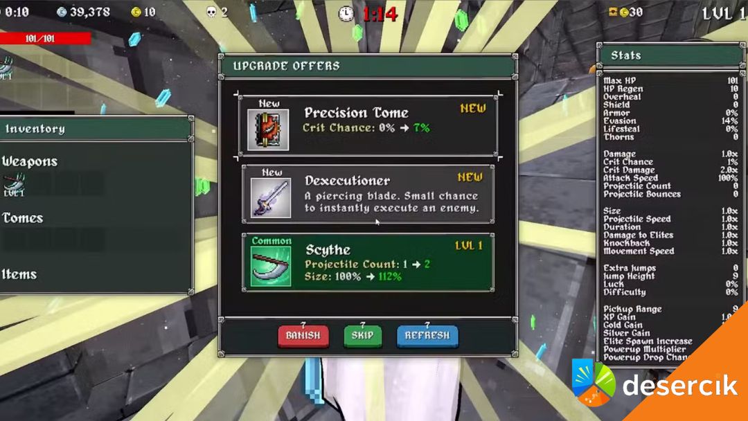 • Broń startowa: Scythe – atakuje wokół gracza, a zabicie Elitarnych wrogów wzmacnia atak.