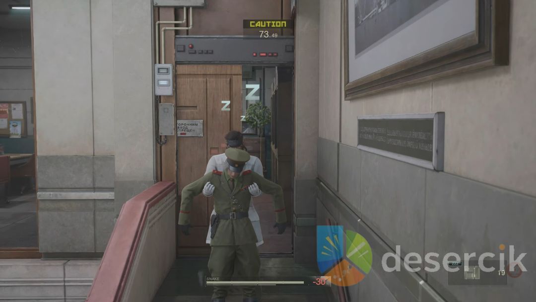Kiedy Major zostanie już ogłuszony lub uśpiony, należy pochwycić jego ciało i przeciągnąć je na piętro wyżej, przez pomieszczenie socjalne aż do szatni znajdującej się w kolejnym pokoju. To właśnie tam uruchamia się charakterystyczna dla serii scenka przerywnikowa – Snake przebiera się w mundur Reikova, a nieprzytomny oficer zostaje zamknięty w jednej z szafek. Od tego momentu mamy pełną swobodę kontynuowania misji w nowej tożsamości.