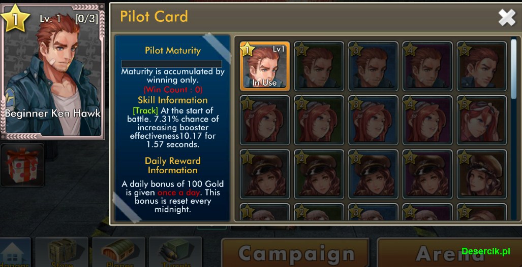 Jednak nie sama maszyna wygrywa walki, ale jej pilot, bez którego nie byłoby możliwe niejedno zwycięstwo. Klikając na kartę swojego pilota uzyskać wszelkie możliwe informacje na jego temat. Widzimy tu między innymi jego wiek, który uzależniony jest od ilości wygranych walk jak i informację o specjalnych umiejętnościach plus to jakie dodatki przynosi nas w codziennych bonusach, głównie jest to bonus do złota, który otrzymujemy raz dziennie.