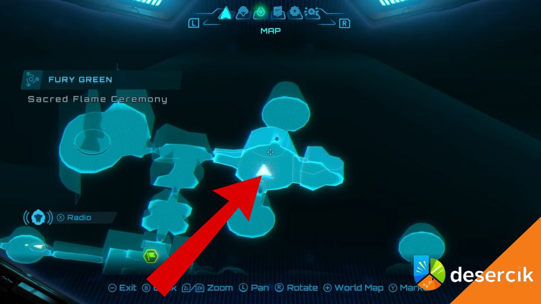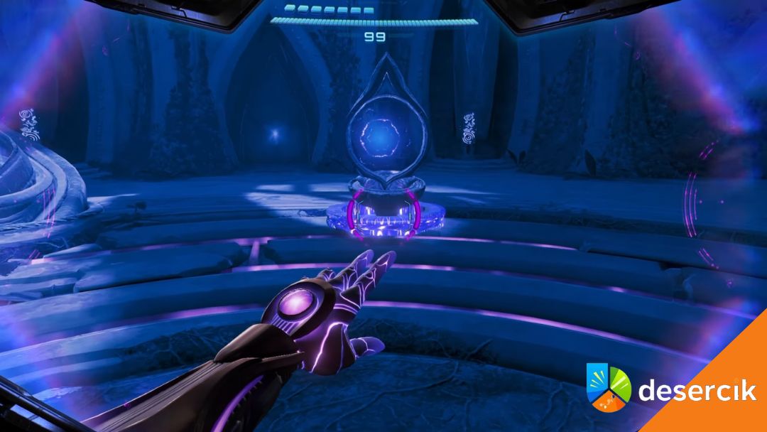 Po odblokowaniu drzwi wejdziesz do sali Sacred Flame Ceremony. Zwróć uwagę na fioletowy blask, który wskazuje, że trzeba użyć psychicznych zdolności Samus.