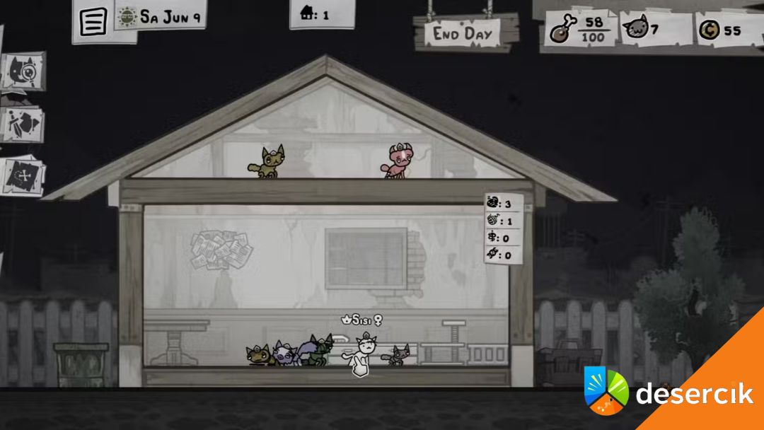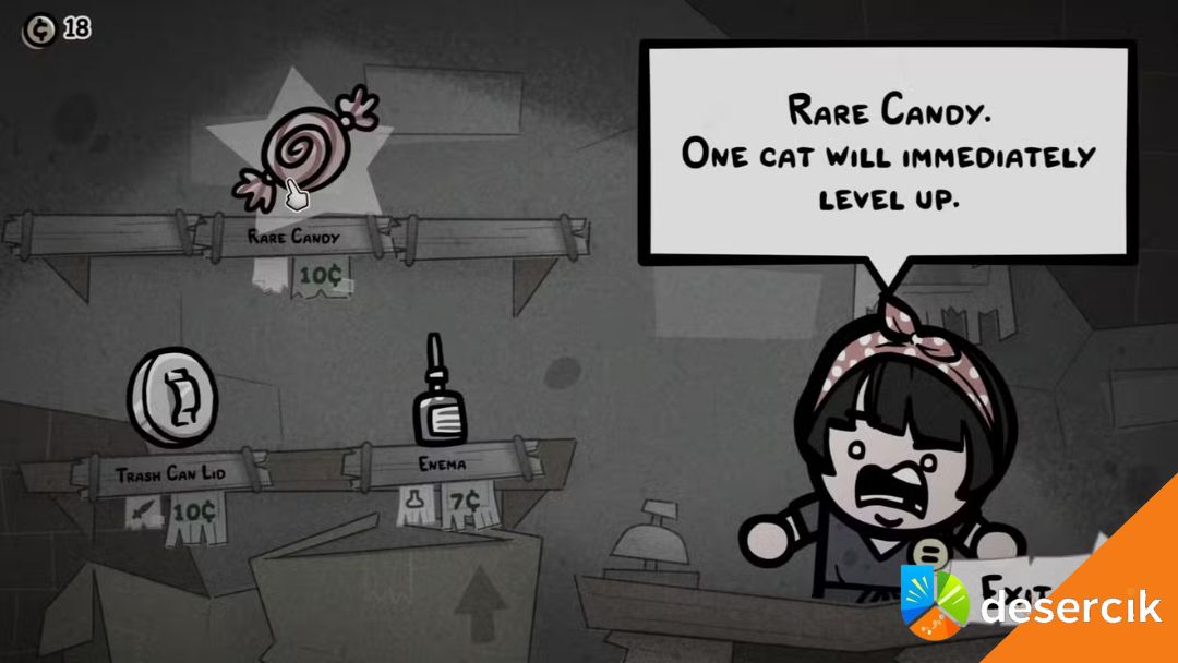 • Przedmioty często mają ograniczone użycia, ale niektóre mogą podnosić statystyki kotów co turę bez konsekwencji.