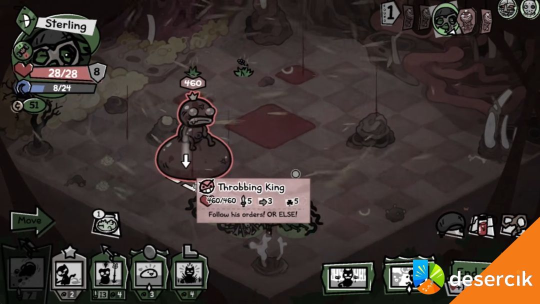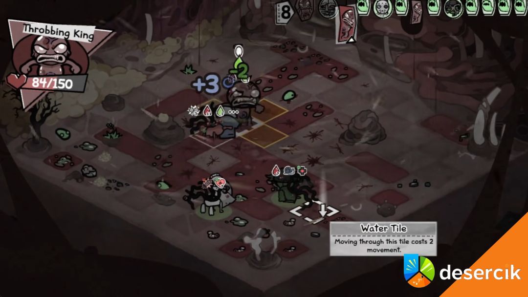- Rundy parzyste: na końcu rundy Throbbing King uderza wszystkie zaznaczone pola – obrażenia mogą dochodzić do ~20!