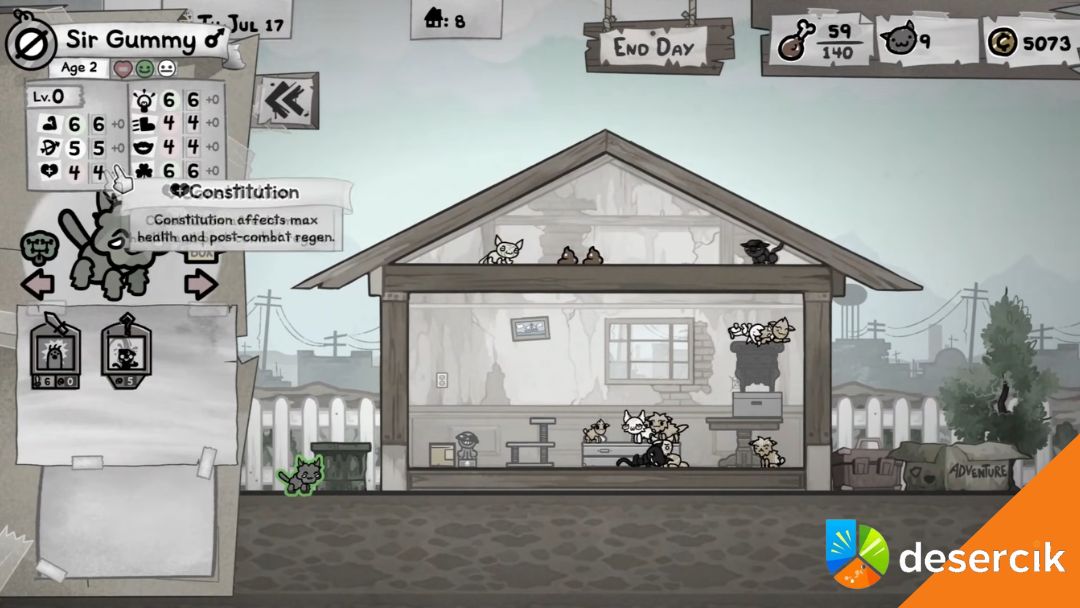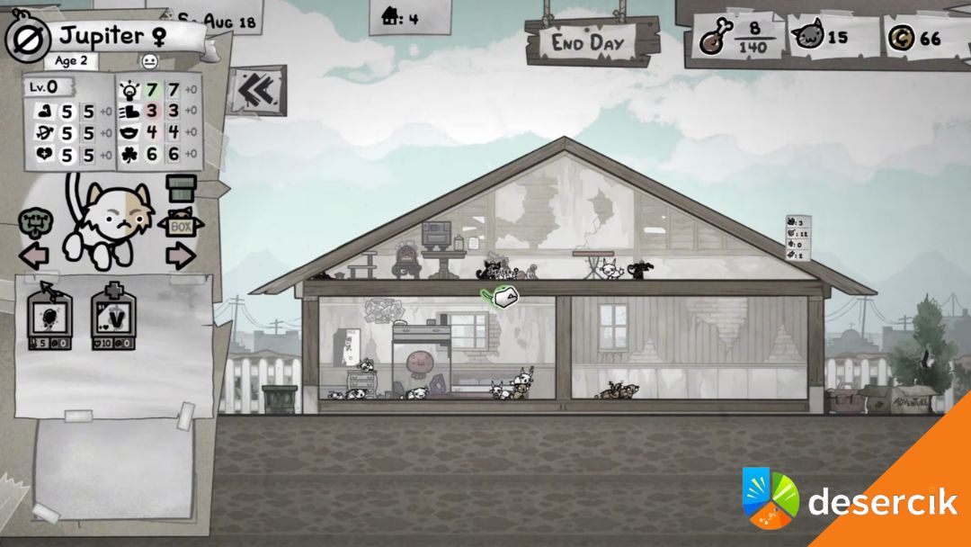 Wczesna gra bywa trudna pod względem funduszy, więc warto skupić się najpierw na podniesieniu Atrakcyjności Domu. Kupując meble od Baby Jacka, zwiększasz szansę na pojawienie się wyższej jakości kotów-stray, które mają mocniejsze statystyki i lepsze umiejętności. Bez tego będziesz w kółko kręcić się w pętli średniaków.