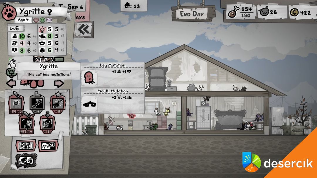 No i dochodzimy do sedna Mewgenics, czyli hodowli. Mutacje z hodowli potrafią całkowicie zmienić charakter postaci. Możesz wyhodować linię kotów, które naturalnie mają wyższy Speed. Możesz połączyć mobilność z konkretnymi zdolnościami ofensywnymi. W dłuższej perspektywie to właśnie hodowla pozwala stworzyć prawdziwe potwory kontroli mapy. Koty, które nie tylko atakują, ale też zawsze są tam, gdzie trzeba.