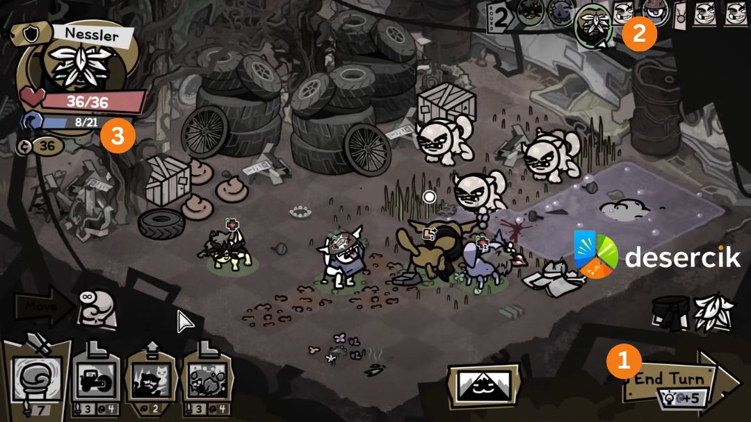 Gdy skończysz ruch kota lub znajdzie się w miejscu, gdzie nie może nic zrobić, zakończ jego turę przyciskiem w prawym dolnym rogu (1) i przejdź do kolejnego kota. Pamiętaj, że opuszczenie tury bez użycia obrony pozwala wrogom cię zranić. Dlatego jeśli kot ma zdolność Block, użyj jej przed zakończeniem tury, szczególnie przy bossach, które mogą zamrażać, palić czy nakładać inne efekty.