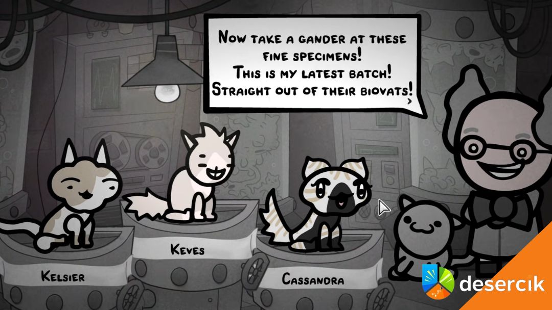 Szalony naukowiec od razu rzuci komentarzem, że dziwi się twoim wyborom – to w 100% zastrzeżony żart gry, niezależny od tego, które koty wybierzesz. Gra chce po prostu wprowadzić trochę humoru i sprawdzić, czy dajesz się wciągnąć w jej dziwaczny świat.