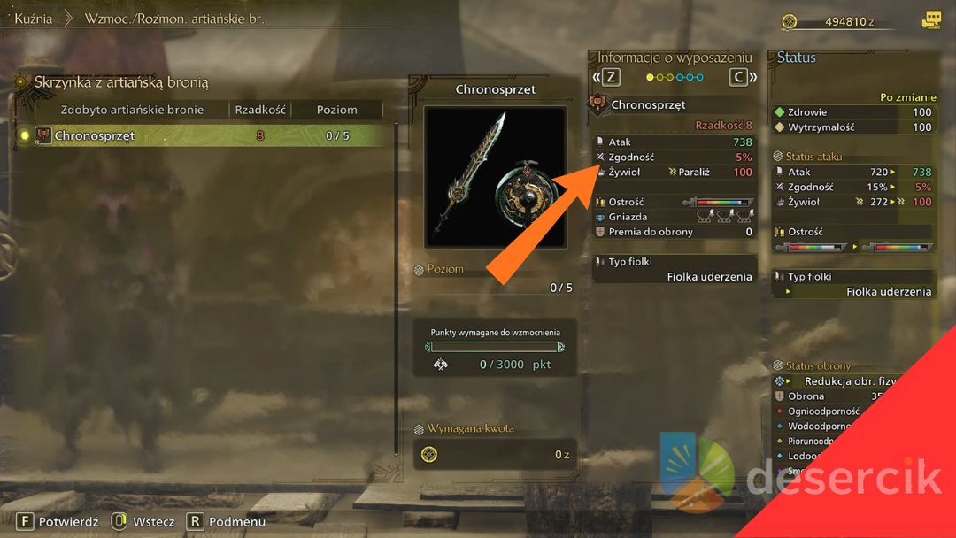 W praktyce Zgodność oznacza szansę na trafienie krytyczne, czyli moment, gdy Twój atak zada więcej surowych obrażeń niż normalnie. Na początku gry, standardowa Zgodność wynosi 0%, co oznacza brak krytyków. Jeśli jednak wytworzysz broń z 5% Zgodności, każdy atak będzie miał 5% szansy na zadanie krytycznych obrażeń.