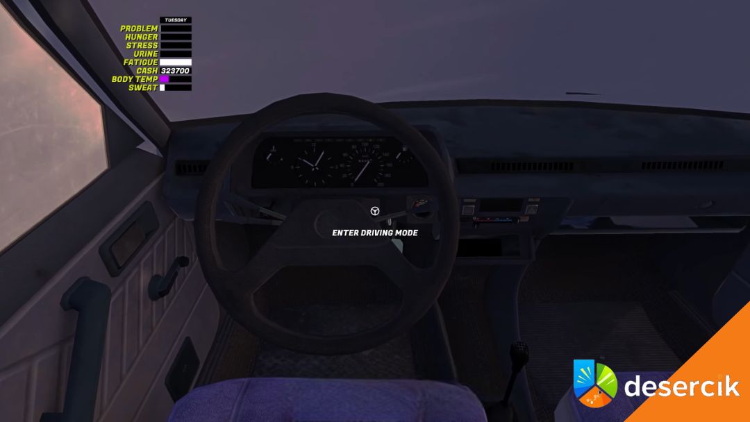 Odpalanie auta w tej grze to mały rytuał, a nie jedno kliknięcie. Najpierw naciśnij Enter, żeby wejść w tryb jazdy. Kliknij stacyjkę – kontrolki na desce powinny się zapalić.