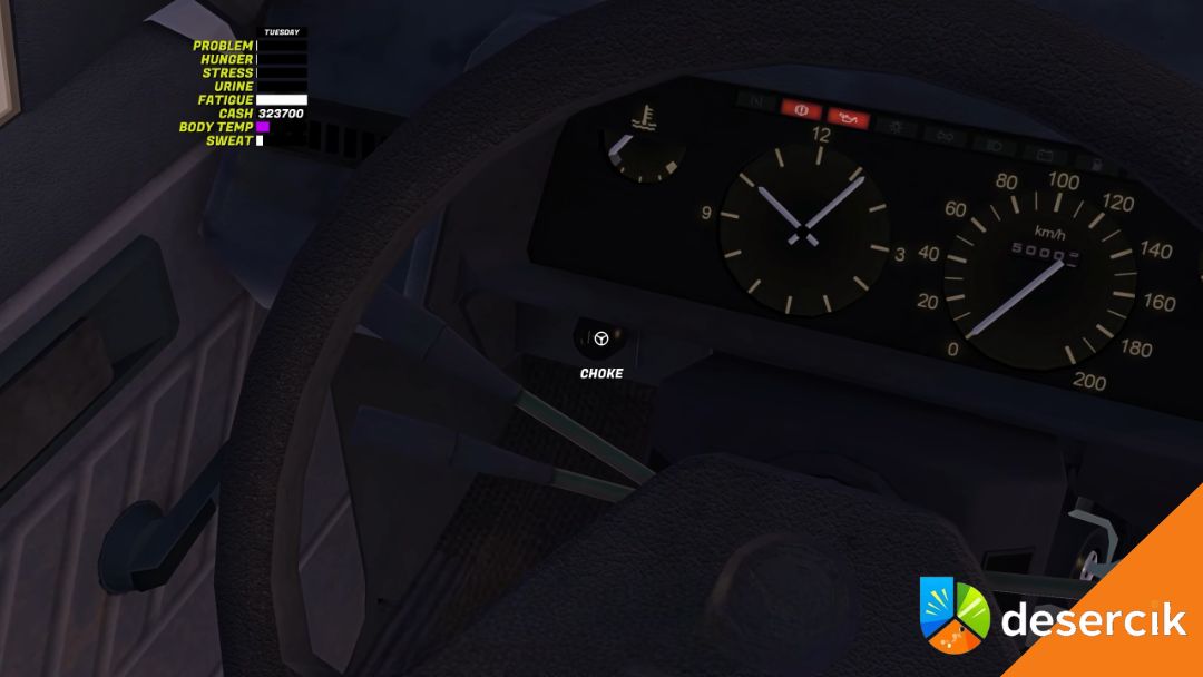Teraz przytrzymaj LMB na stacyjce, aż silnik zaskoczy. Po kilku minutach jazdy możesz powoli wciskać ssanie z powrotem, używając prawego przycisku myszy. Nie rób tego za szybko – zimny silnik potrafi się zemścić.