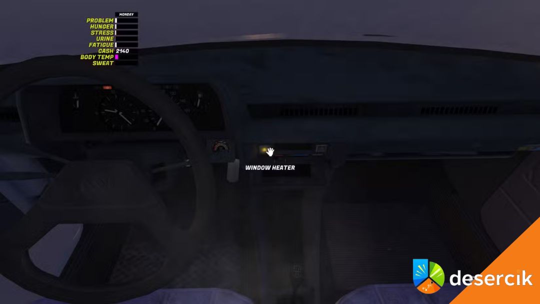 Wsiądź do auta, najedź kursorem na stacyjkę i kliknij raz, żeby włożyć kluczyk. Silnik musi działać, żeby ogrzewanie w ogóle miało sens.