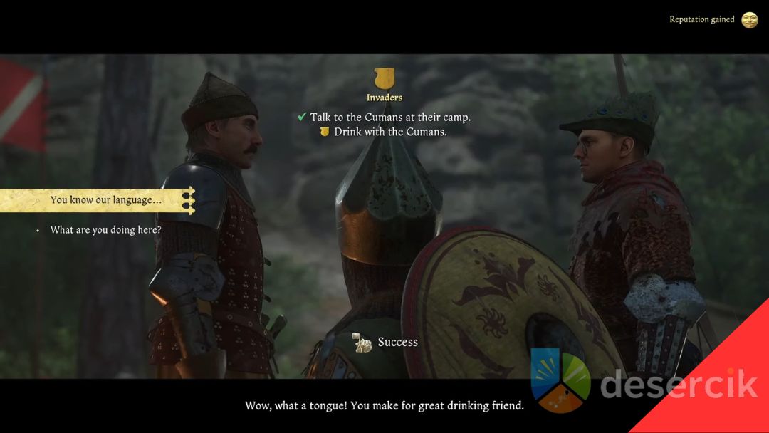 Dyplomacja i empatia – Druga opcja wymaga cierpliwości. Możesz zaprzyjaźnić się z Kumanami, a kluczowym elementem jest wspólne picie bimbru. Zdobądź go u miejscowych wieśniaków, w piwnicach karczmy lub jako łup ze skrzyń, a potem wróć do obozu i zaproponuj wspólne spotkanie przy trunku. Kumanowie, choć początkowo nieufni, mogą otworzyć się na rozmowę, dzięki czemu poznasz ich historię i motywacje.