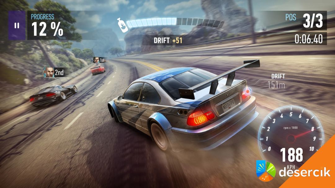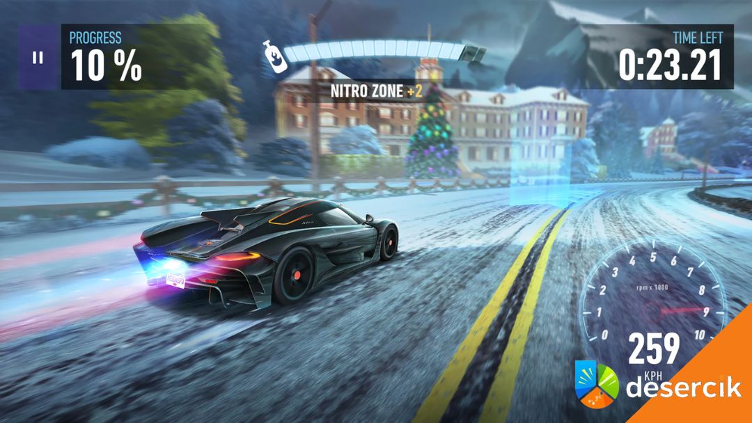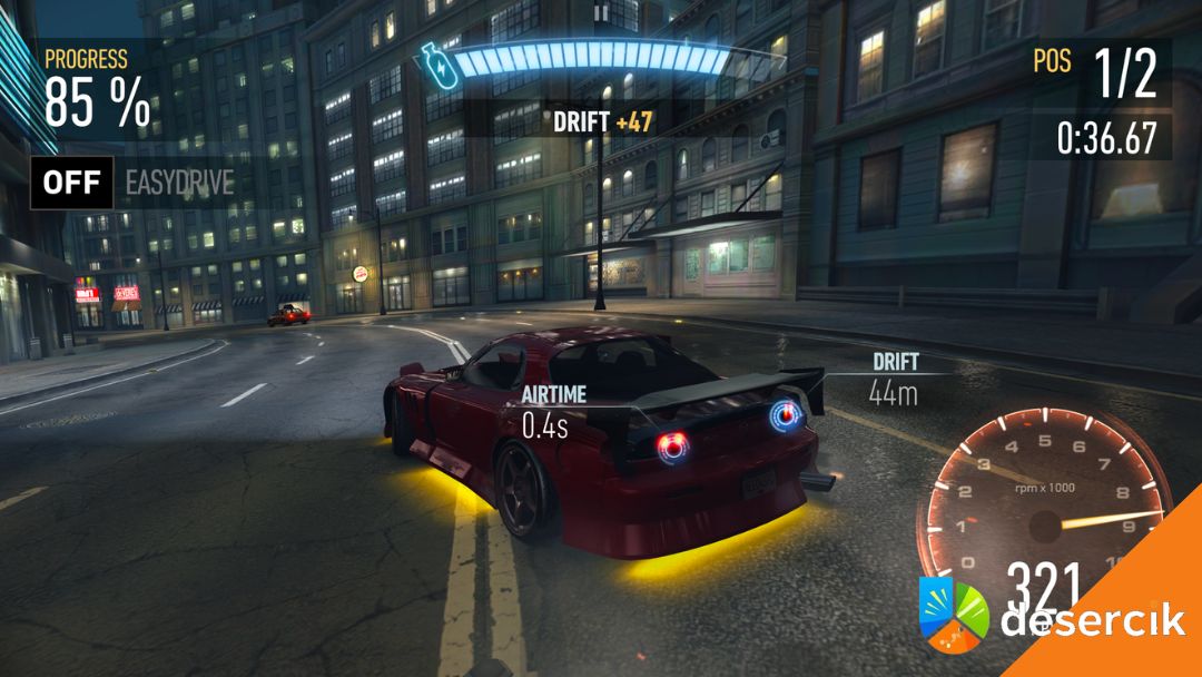 Sterowanie jest proste i dobrze dopasowane do ekranu dotykowego. Domyślny schemat opiera się na stukaniu w boki ekranu do skręcania oraz gestach do driftu i nitro. Jest responsywnie i intuicyjnie, bez walki z telefonem. Co ważne, gra nagradza styl jazdy. Driftowanie, jazda na zderzaku rywala czy ryzykowne mijanki szybciej nabijają pasek dopalacza. Jest tu mała warstwa strategii, ale bez komplikowania.