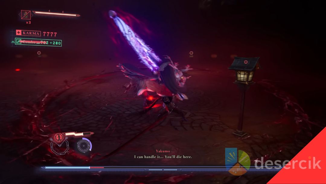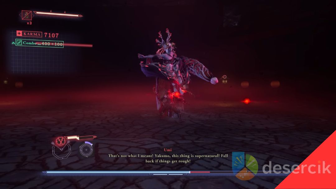 Po utracie pierwszego paska zdrowia, Kitsune Courtesan przywołuje pięć latających parasoli, które przemieszczają się po arenie. Poruszają się w ustalonym rytmie, więc jeśli go wyczujesz, łatwo je ominiesz. Atak pojawia się losowo, dlatego zawsze bądź gotowy na szybkie reakcje.