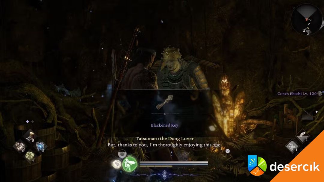 Teraz najważniejsze: Blackened Key. Po zakończeniu misji wracasz do Eternal Rift i wchodzisz do sklepu kowala. Idź w róg pomieszczenia i zejdź do piwnicy. Jeśli wcześniej tego nie robiłeś, użyj Guardian Spirit, aby zniszczyć blokujący kamień, i zejdź po korzeniach. Tam znajdziesz Tatsumaro, Dung Lover, który chętnie przyjmie wszystkie Dung Balls, które mu przyniesiesz.