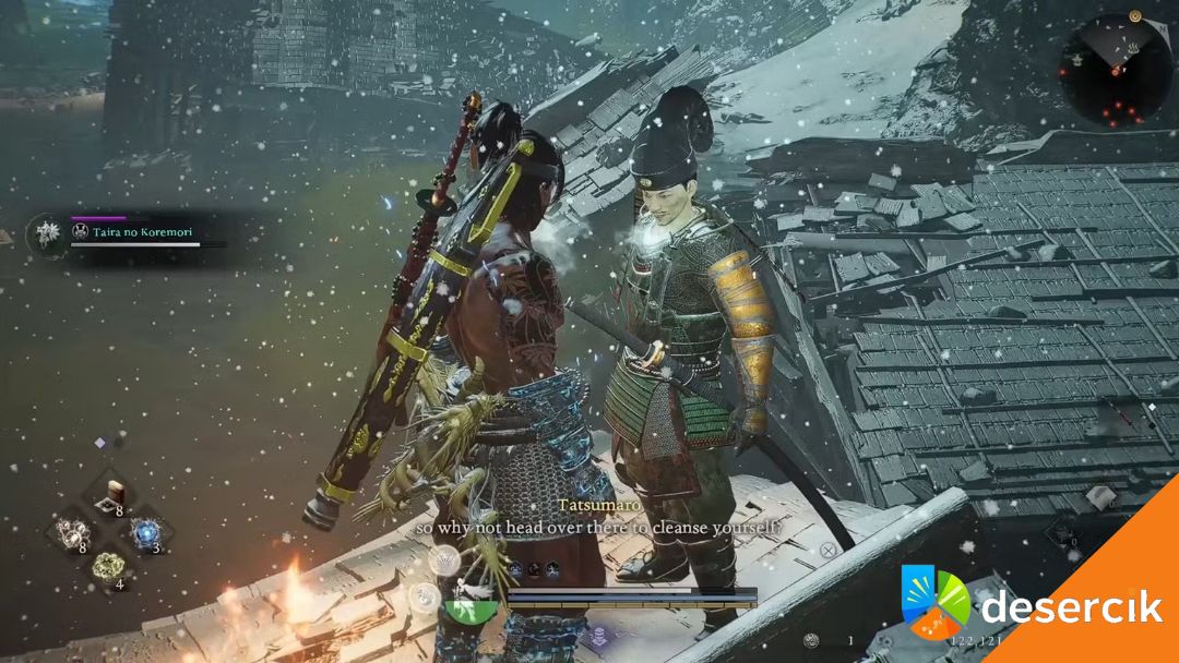 Zaczynamy w Hachijo, niedaleko Rajomon: Mibu Avenue Shrine. Tam, w bagnistej okolicy, znajdziesz Tatsumaro stojącego na jednym z dachów. Ten wojownik ma… powiedzmy, “problem zapachowy”, którego chce się pozbyć. Twoim zadaniem jest poprowadzić go do Hot Spring, korzystając z markera na mapie. Po drodze Tatsumaro zdradza, że w jego domu znajduje się fantastyczna łaźnia, ale nie może się do niej dostać, bo teren zdominowały hordy yokai. Jeśli zgodzisz się mu pomóc, dostaniesz możliwość korzystania z tej kąpieli i serio, jest to nagroda warta zachodu, bo w Nioh nic nie jest tak przyjemne jak chwila oddechu wśród chaosu walki.