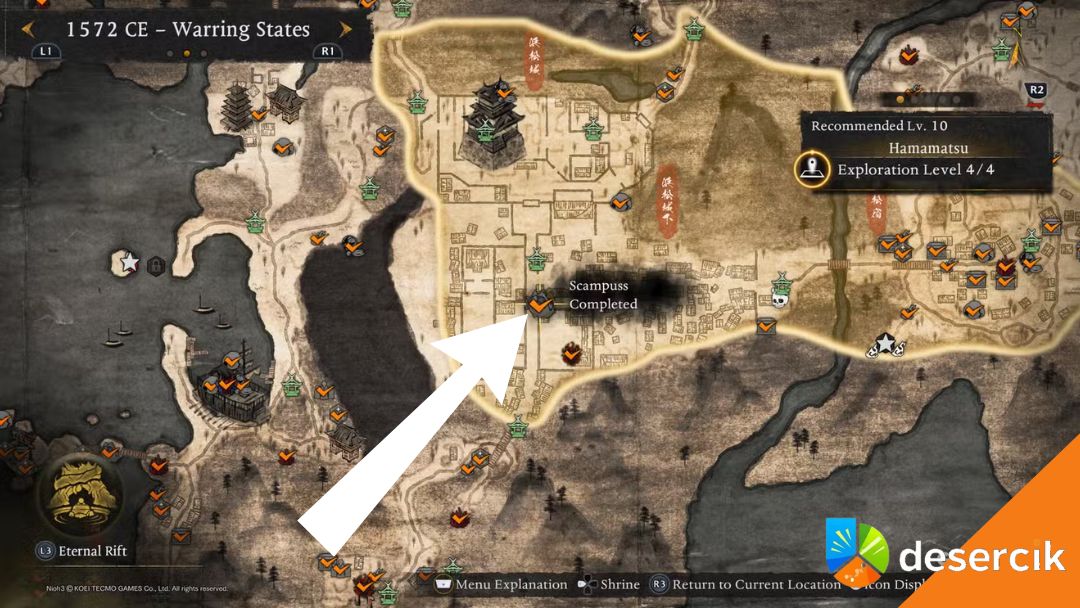 Następny Scampuss pojawia się w regionie Hamamatsu, przeznaczonym dla postaci na około 10 poziomie. Ten egzemplarz wymaga już pewnego postępu fabularnego. Najpierw musisz ukończyć misję Crucible i pokonać bossa Jakotsu-Baba. Dopiero wtedy możesz użyć szybkiej podróży do Otemon Gate, a następnie ruszyć na południe, gdzie znajdziesz Scampussa czekającego przy bocznej ścieżce.