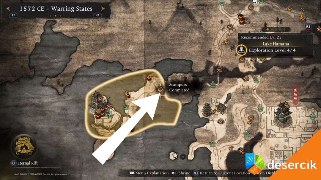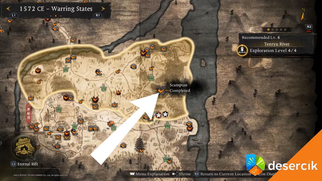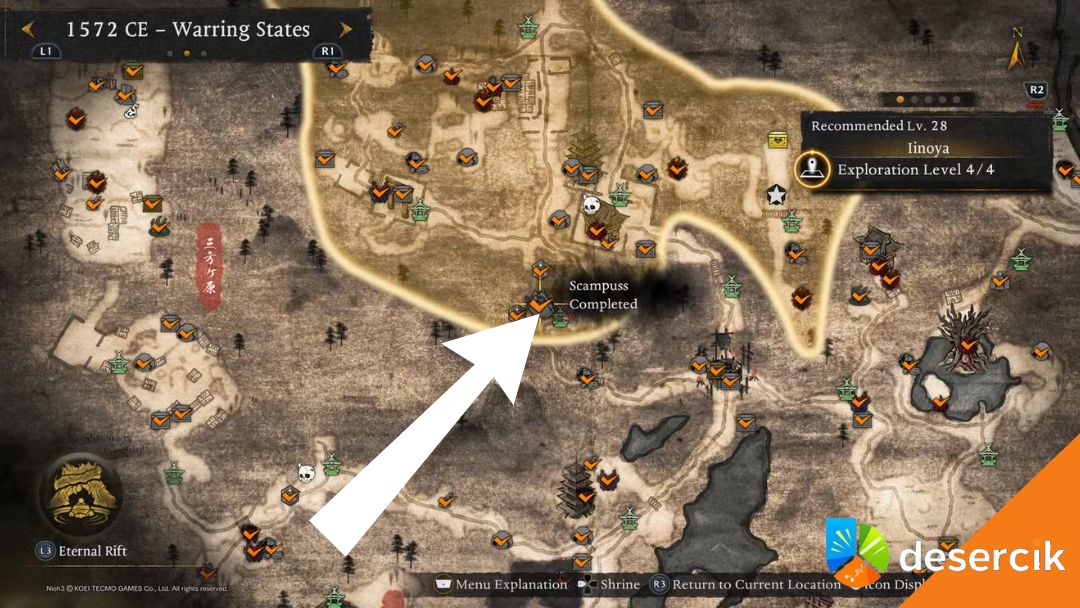 Ostatni Scampuss w Warring States znajduje się w regionie Iinoya, zalecanym na 28 poziom. Rozpocznij przy Kapliczce Iinoya Pass, podążaj drogą przed siebie i skręć w lewo. Na skrzyżowaniu ponownie wybierz lewą stronę, aż zauważysz ścieżkę prowadzącą na południe. W tym miejscu znajdziesz Strumień Duchowej Energii, który zabierze cię bezpośrednio do Scampussa.