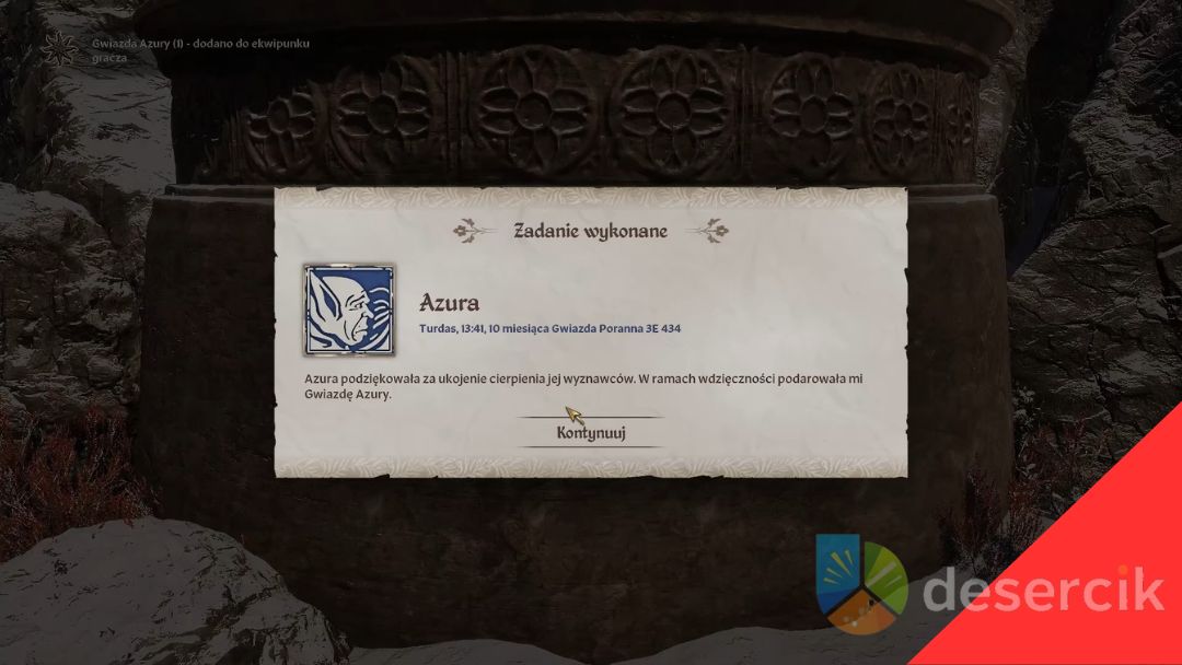 Pamiętaj tylko o jednym – Azura odpowiada jedynie o 6:00 rano lub 18:00 wieczorem. Na miejscu spotkasz Melsa Maryona, który wytłumaczy ci, co trzeba zrobić, żeby przyzwać boginię.