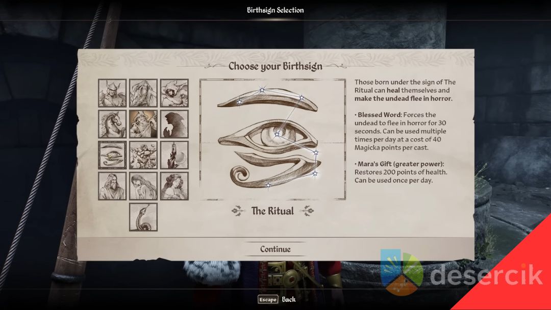Wybór Znaku Zodiaku następuje podczas samouczka, po ustaleniu rasy bohatera, ale jeszcze przed wybraniem klasy i punktów umiejętności. Po krótkiej wędrówce przez kanały pod Cesarskim Miastem spotykasz cesarza Uriela Septima i jego strażników – to właśnie wtedy otwiera się menu wyboru konstelacji.