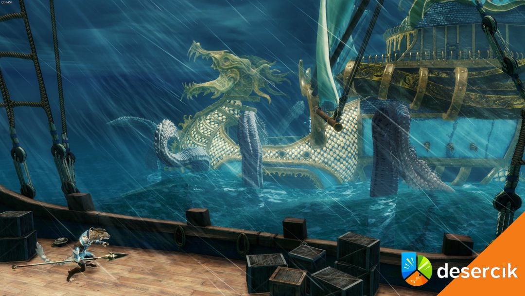 Pod względem klimatu cała instancja opiera się na dwóch głównych filarach. Pierwszy to gwałtowny sztorm na bezkresnym Unending Ocean. W jego trakcie gracze muszą odpierać ataki znanych przeciwników, takich jak krait, reef riders, karka czy nawet macki krakena. Drugi element to gęsta mgła otaczająca Castorę. Jest spokojniejsza niż burza, ale za to pełna niepokoju, tajemnicy i poczucia zagrożenia. Samo dopłynięcie do brzegu staje się ryzykowną, aktywną sekwencją, a nie tylko przerywnikiem fabularnym.