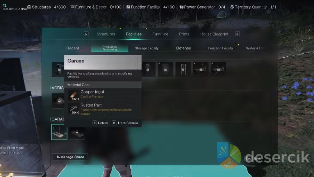 Do zbudowania garażu potrzebujesz Rusted Parts i Copper Ingots. Gdy garaż już stoi, możesz w nim rozpocząć proces tworzenia swojego roweru. Wejdź w interfejs warsztatu i naciśnij X (na PC), by otworzyć listę pojazdów. Wybierz Feet i zacznij tworzyć jego elementy.