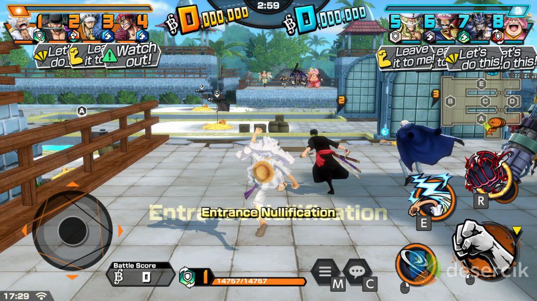 Gracze wybierają postaci podzielone na trzy role: Atakujący (skupieni na zadawaniu obrażeń), Obrońcy (chroniący punkty skarbów) oraz Biegacze (szybko przejmujący punkty). Każda postać ma podstawowy atak, dwie unikalne umiejętności specjalne oraz unik, sterowane za pomocą ekranowego joysticka i przycisków. Mapy zawierają elementy środowiskowe (np. ulepszenia) i przeszkody, co dodaje rozgrywce strategicznej głębi. Na przykład windy bąbelkowe na Sabaody wprowadzają unikalne mechaniki ruchu.