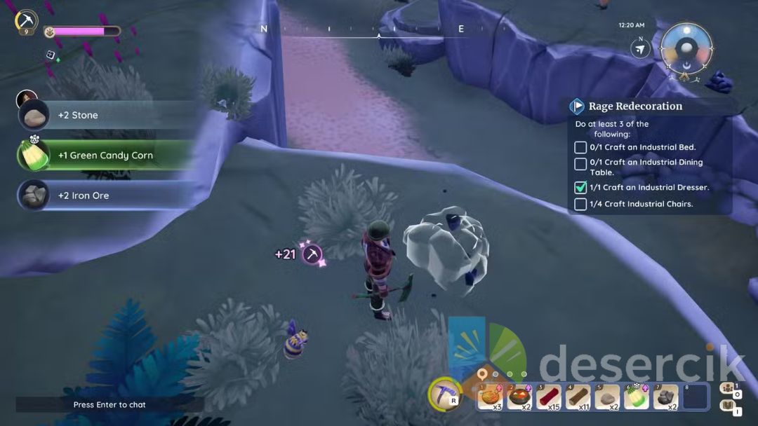 Zielony Candy Corn – ten wariant wymaga wydobywania skał i rud. Można to robić w dowolnym regionie – Kilima, Bahari Bay czy Elderwood – bo cukierek wypada losowo z kamieni. To dobra okazja, żeby połączyć farmienie Candy Corn z gromadzeniem surowców potrzebnych do rzemiosła.