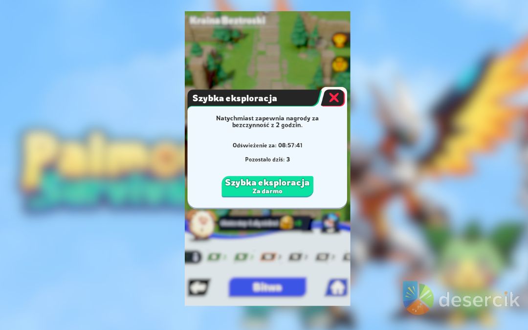 W ramach Trybu Beztroskiego dostępna jest też Szybka Eksploracja. Dzięki niej możesz natychmiast odebrać nagrody, które normalnie wymagałyby długiego oczekiwania. Pierwsze 2-3 użycia dziennie są darmowe, a każde kolejne kosztuje 100 Palite. Niestety, płatne przyspieszenia nie są opłacalne, więc najlepiej korzystać jedynie z darmowych prób, a resztę Palite przeznaczyć na rozwój VIP lub ważne wydarzenia.