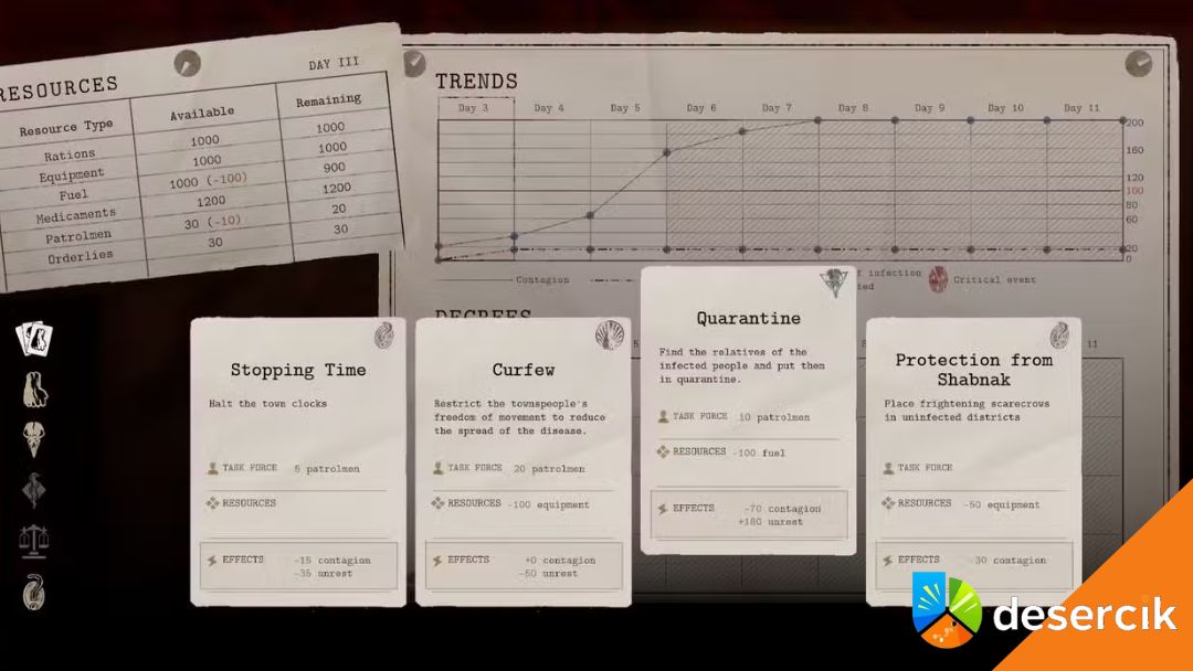 Dekrety możesz modyfikować retroaktywnie od Dnia 3. Ważne jest regularne diagnozowanie pacjentów, by odblokować dodatkowe narzędzia do walki z plagą. Im lepiej kontrolujesz epidemię i niepokoje, tym łatwiej poruszać się po mieście.