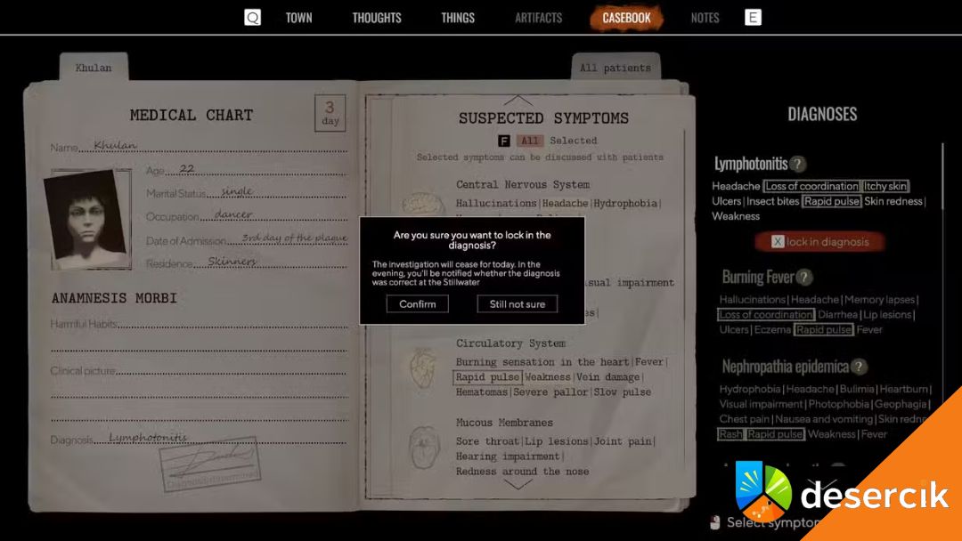- Zbierz wszystkie możliwe symptomy z dialogów, portretu i badań ciała.