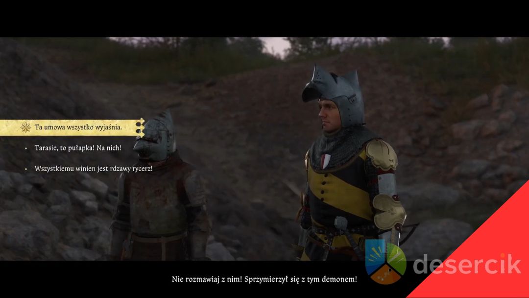 - Umiejętność perswazji – użyj zdolności mowy, aby przekonać zarówno rycerza, jak i mieszkańców do kompromisu. Wybierając odpowiednie opcje dialogowe, możesz zakończyć misję bez walki, co przyniesie Ci pozytywną reputację i nagrodę pieniężną.