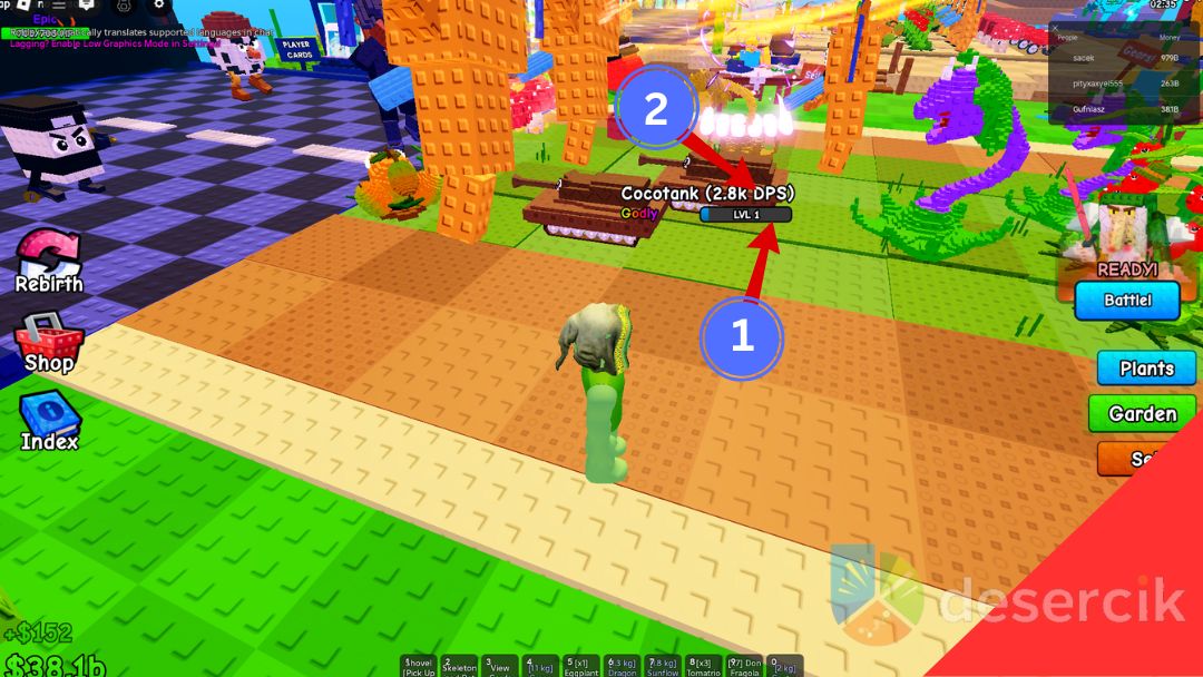 Od wersji 1.6.0 oprócz mutacji możesz też awansować rośliny na wyższe poziomy, co nie tylko wygląda fajnie, ale też daje konkretne bonusy. Poziomowanie zwiększa DPS rośliny (2), czyli jej skuteczność w niszczeniu wrogów – im wyższy poziom, tym szybciej zbierzesz pieniądze. Aby awansować, po prostu pozwól roślinom zabijać Brainroty na bieżni, aż szara belka pod DPS wypełni się na niebiesko; każdorazowe maksowanie belki (1) podnosi roślinę o jeden poziom.