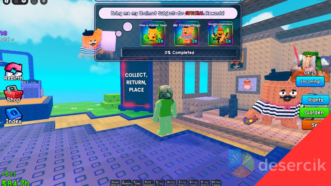 Aby w ogóle ruszyć z zadaniem, najpierw skorzystaj z lustra, żeby przenieść się na centralną wyspę. Tam znajdziesz tablicę z listą wymaganych brainrotów. Gdy już zdobędziesz jednego z nich, podejdź do stołu w środku strefy wydarzenia, przytrzymaj brainrota i naciśnij klawisz E, by go dostarczyć. Każde takie przekazanie przybliża cię do ukończenia eventu. Po dostarczeniu 20 brainrotów otrzymasz nasiono Pine-a-Painter i postać Mr Croissantiago – to główne nagrody całej zabawy.