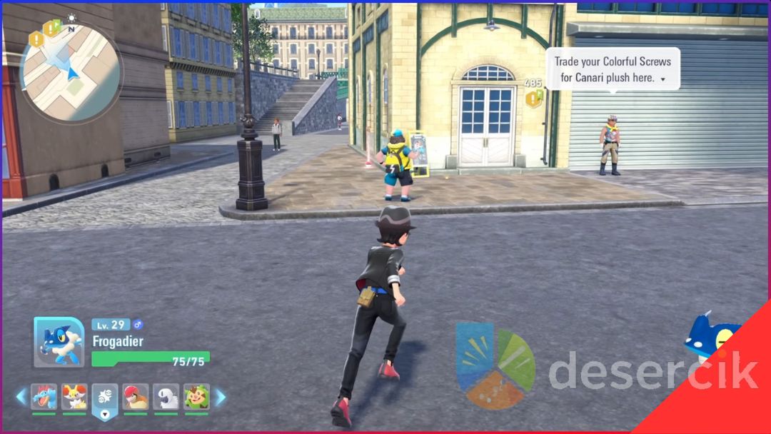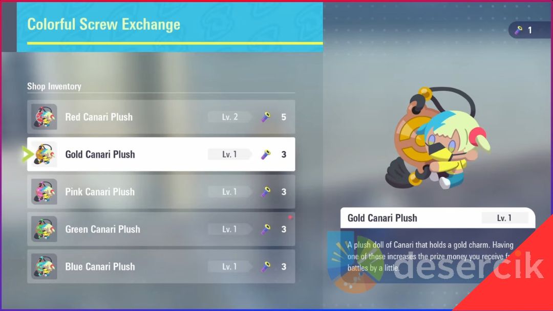 Wymiany Kolorowych Śrub można dokonać w Racine Construction, znajdującej się w południowo-wschodniej części Lumiose City, przy South Boulevard. Przed budynkiem stoi pracownik budowy, który oferuje wymianę Śrub na Pluszaki Canari (Canari Plushes). Aby rozpocząć wymianę, gracz musi zebrać przynajmniej 3 Kolorowe Śruby. Warto jednak pamiętać, że punkt szybkiej podróży do tego miejsca odblokowuje się dopiero później w grze.