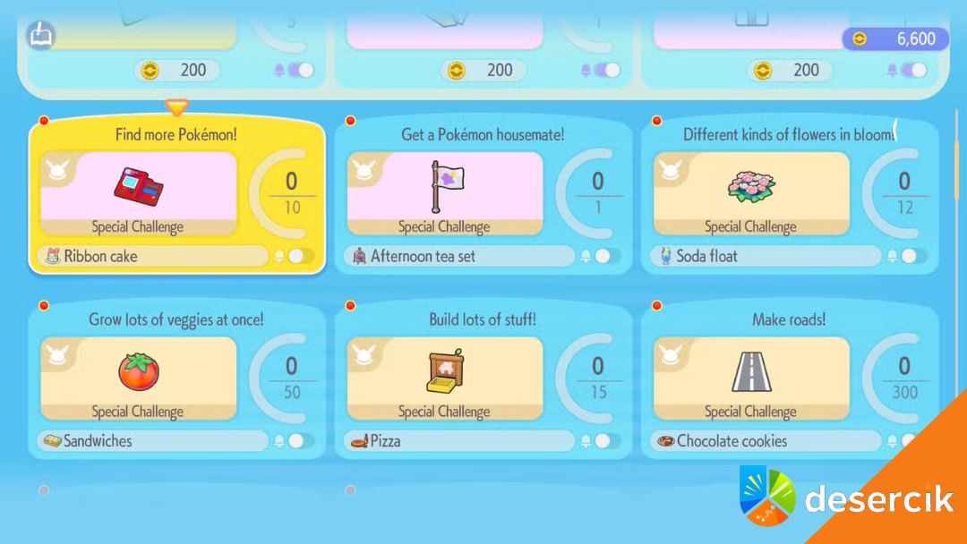 W sumie jest osiem specjalnych wyzwań, każde daje nagrodę w postaci jedzenia lub napoju, który po postawieniu na talerzu przy dowolnym stole tworzy habitat dla odpowiedniej Eeveelucji. Wszystkie wyzwania muszą być wykonane w obrębie nowego miasta.