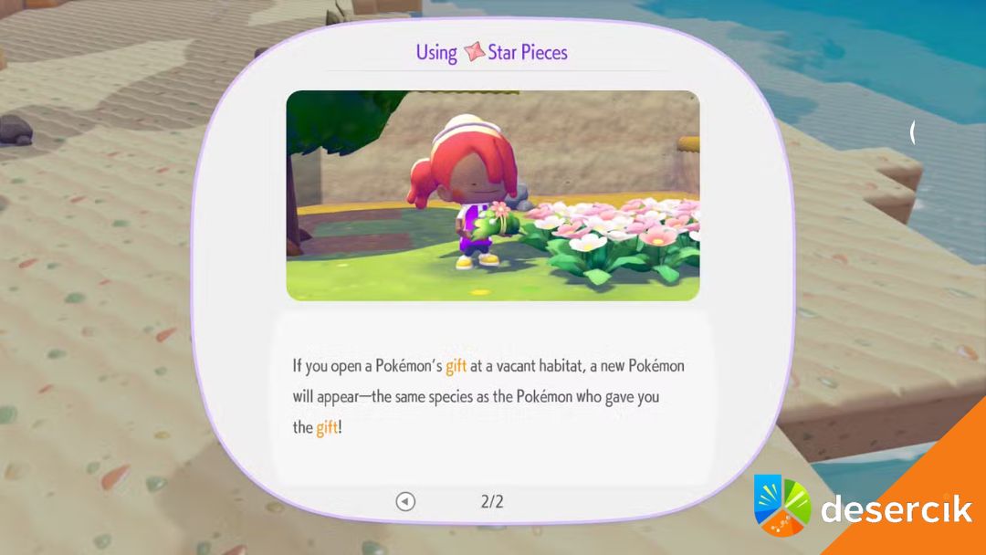 Po tym możesz dać Odłamek Gwiazdy Pokémonowi, którego odkrył inny gracz w swoim świecie. W zamian Pokémon da ci prezent. Kiedy przeniesiesz ten prezent do swojego świata i otworzysz go w pobliżu pustego habitatu, w twojej grze pojawi się Pokémon tego samego gatunku, któremu dałeś Odłamek Gwiazdy. Na przykład, jeśli dałeś Odłamek Gwiazdy Volbeatowi z innego świata, otwierając prezent w swoim świecie, dostaniesz Volbeata. To świetny sposób, żeby odkryć wszystkie Pokémony w Pokopia i w pełni wypełnić Pokédex.