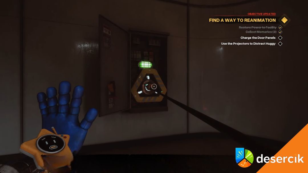 W środku leży druga bateria. Tak samo jak poprzednią, przeciągnij ją do panelu drzwi i włóż w odpowiednie miejsce. Jeśli Huggy patroluje teren, możesz naładować Conductive Hand przy panelach elektrycznych i włączyć projektor. Potwór podejdzie i zajmie się oglądaniem nagrania, co da ci chwilę na spokojne zamontowanie baterii.