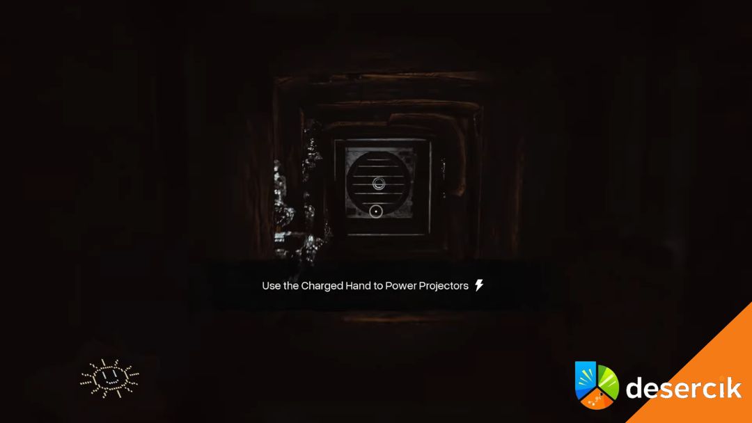Zdobycie trzeciej baterii jest trochę trudniejsze. Po wyjściu z pokoju z drugą baterią wejdź do pomieszczenia naprzeciwko biurka. Znajdziesz tam terminal projektora przykryty pudełkiem. Szybko usuń pudełko i naładuj Conductive Hand przy panelu elektrycznym obok szafki. Następnie uruchom projektor.