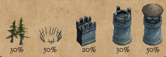 Drzewa, fortyfikacje, mury oraz wieże strażnice zapewniają dodatkową ochronę przed wszystkimi atakami wroga, Chronią też przed szarżą kawalerii.